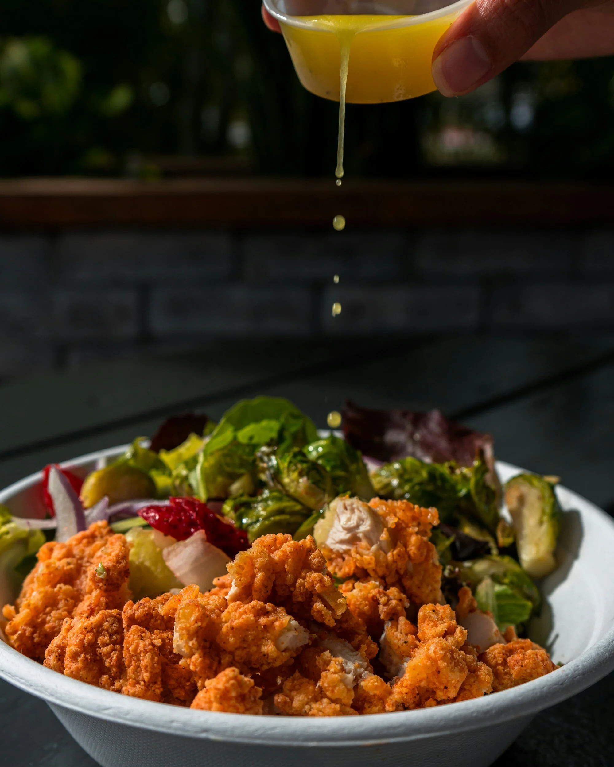 Drizzle the healthy honey mustard dressing over the salad and toss gently to combine.